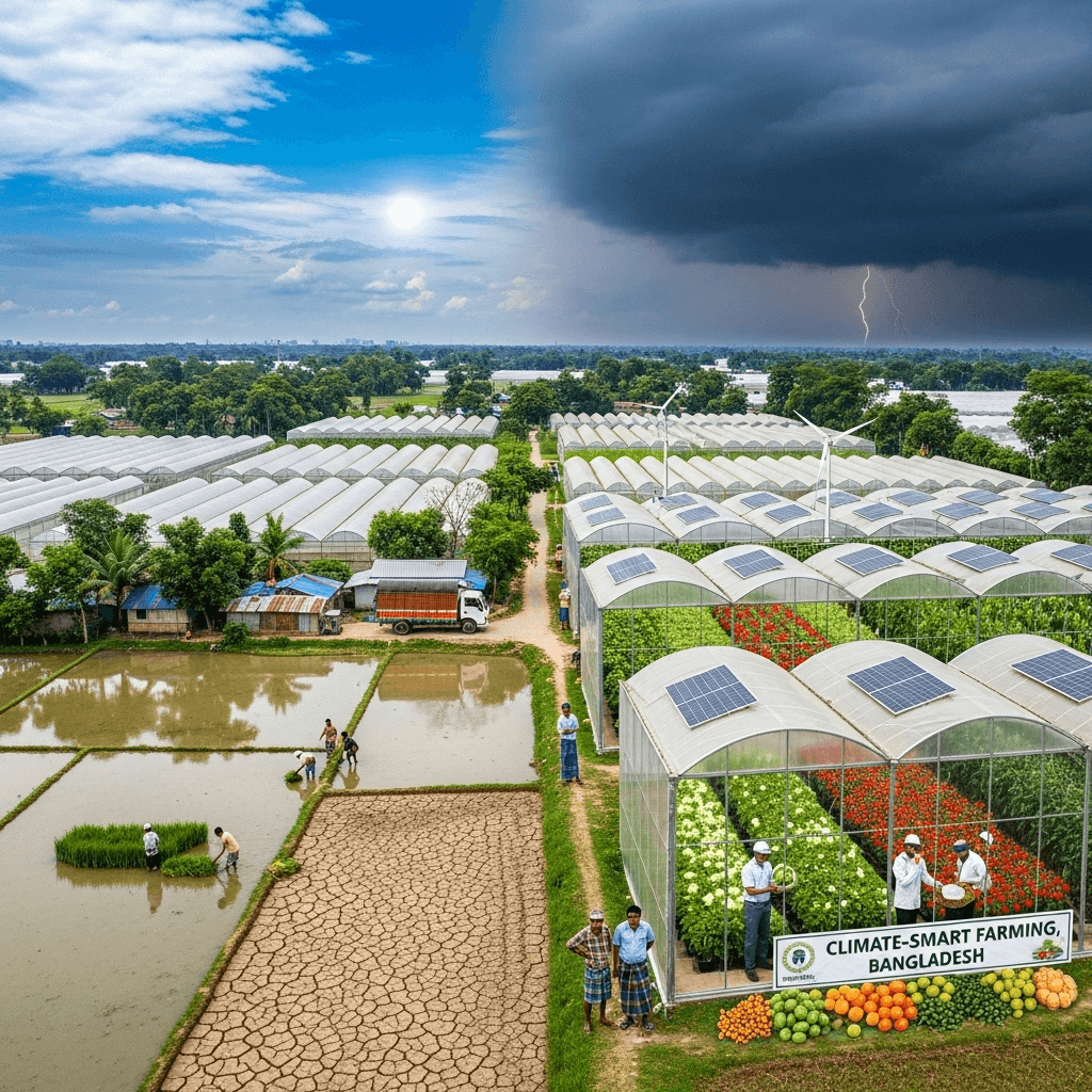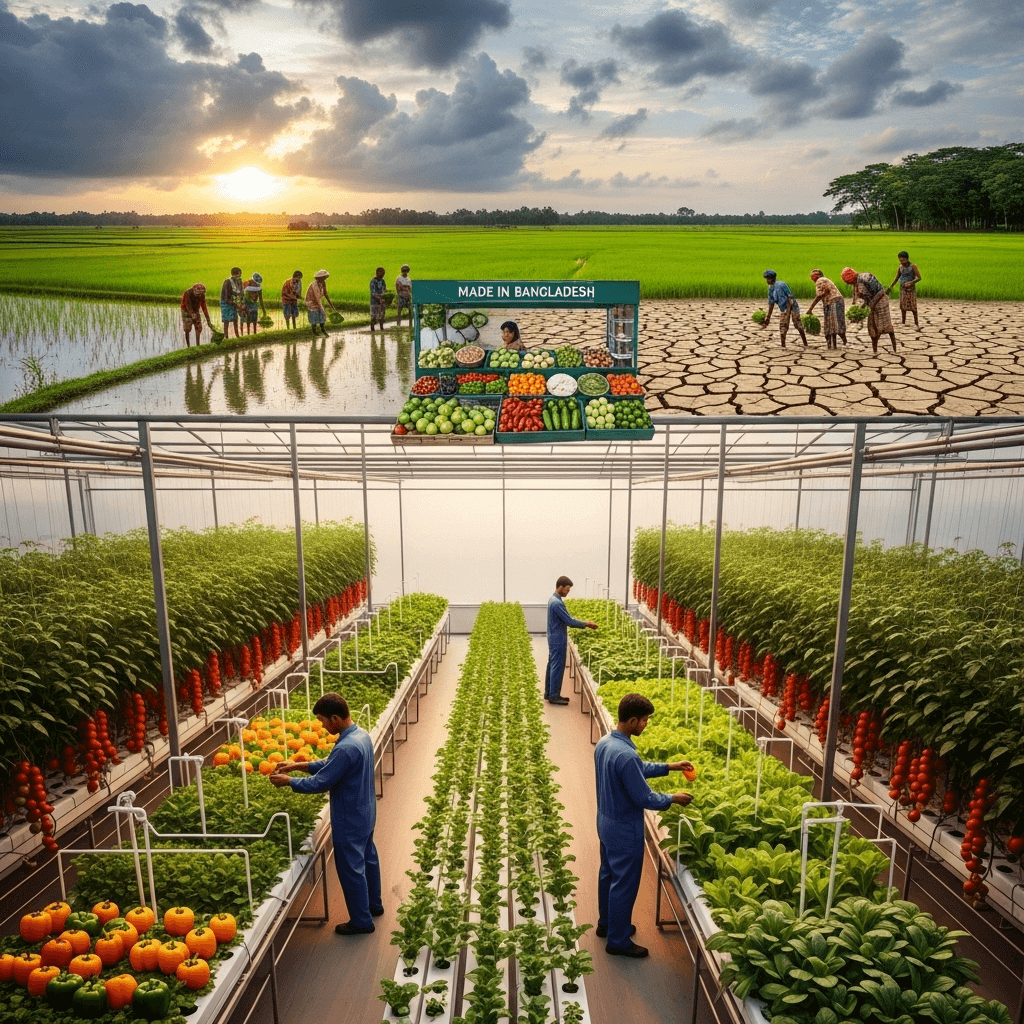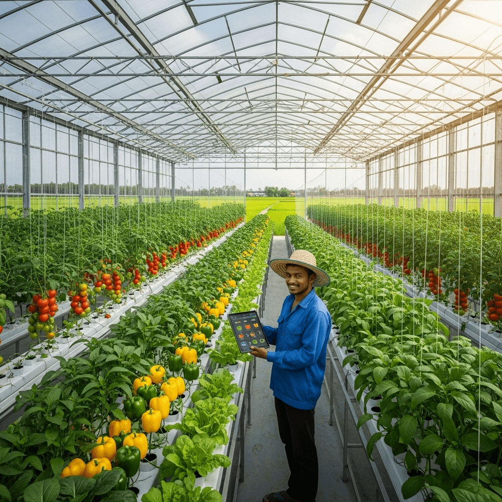 Revolutionizing agriculture in Bangladesh through climate-controlled greenhouses, IoT-enabled monitoring, and sustainable farming practices.